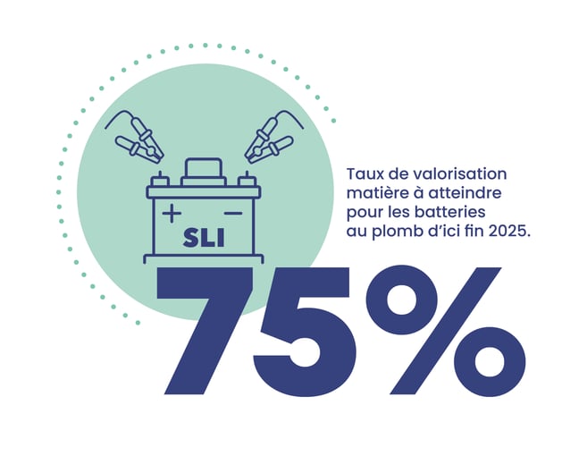 D’ici fin 2025, l’objectif de valorisation matière, lors du recyclage des batteries plomb, est fixé à 75% (cible à 80% en 2030). Concernant la valorisation des métaux les taux sont fixés à : 90% pour le plomb, le cuivre, le cobalt et le nickel et à 50% pour le lithium (d’ici fin 2027).