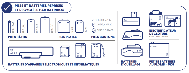 Les piles alcalines, salines, au lithium, zinc-air, zinc-argent et autres piles boutons sont collectées et recyclées par Batribox.